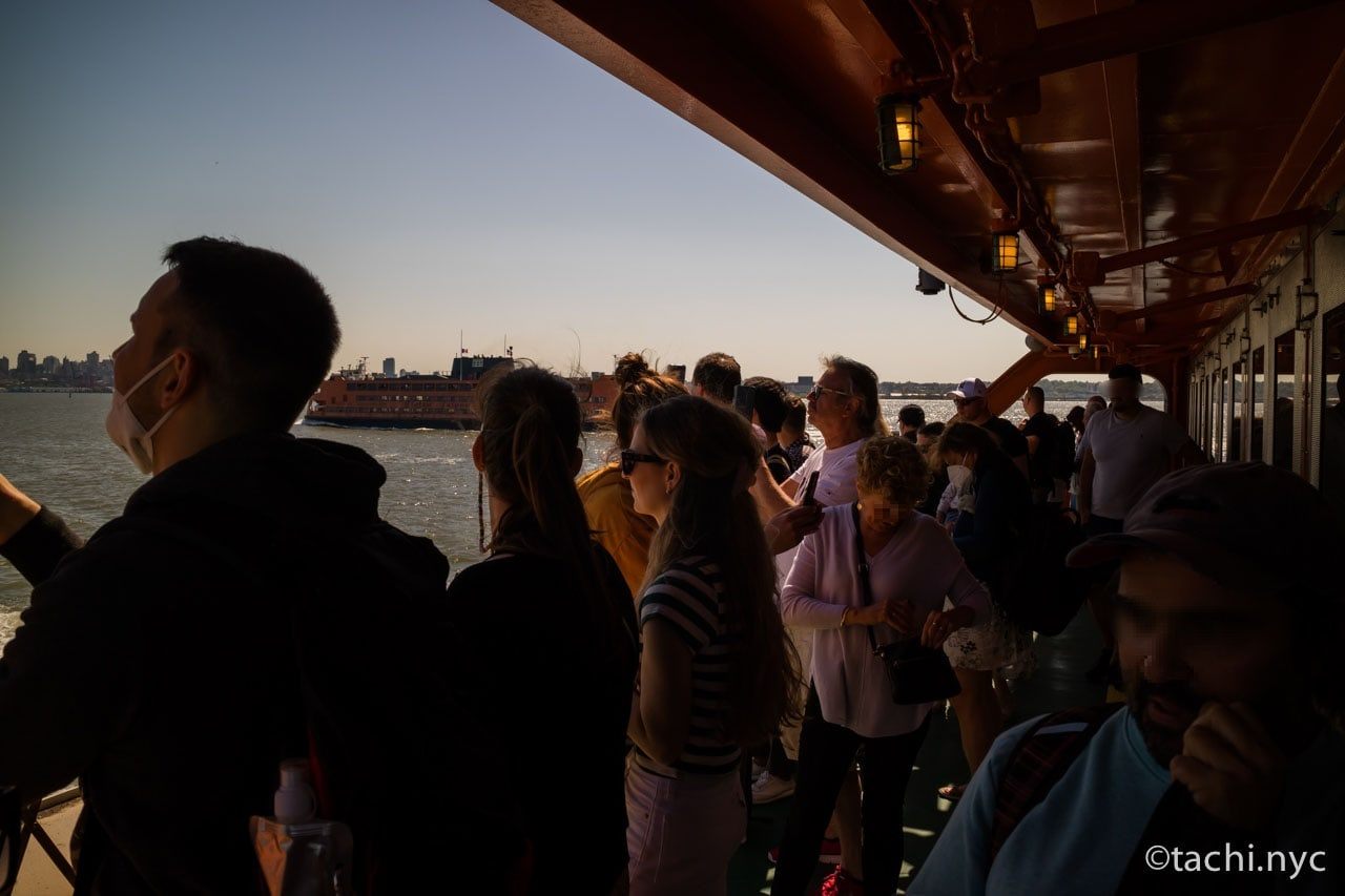 スタテンアイランド行きフェリーは無料で自由の女神が見られるため、観光客にとても人気です。自由の女神は進行方向右側に見えますので、乗船したら急いで場所を確保することをおすすめします。