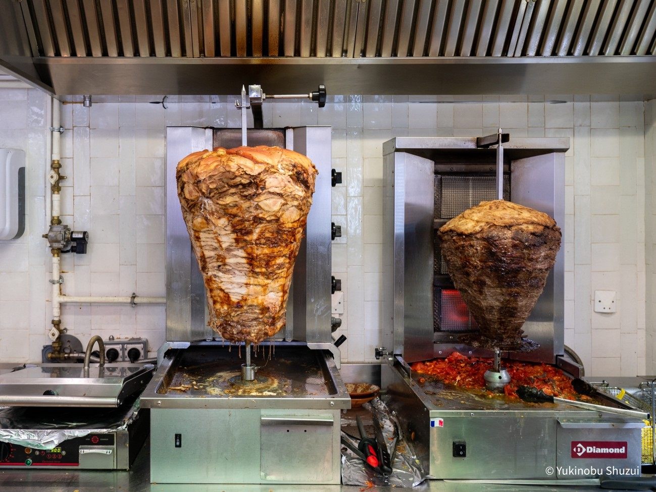 最近では、日本で目にする機会も多くなったケバブ屋さん。フランスでは町のあちこちでケバブが販売されていて、すでに国民食となっています。いくつもの肉を串刺しにしてそれを回しながら焼き、そこから機械やナイフで薄く削ぎ落として、ピタやバゲットに挟み提供されます。トルコ語ではケバブですがアラビア語ではシャワルマと呼び、その名称になっている店もあります。