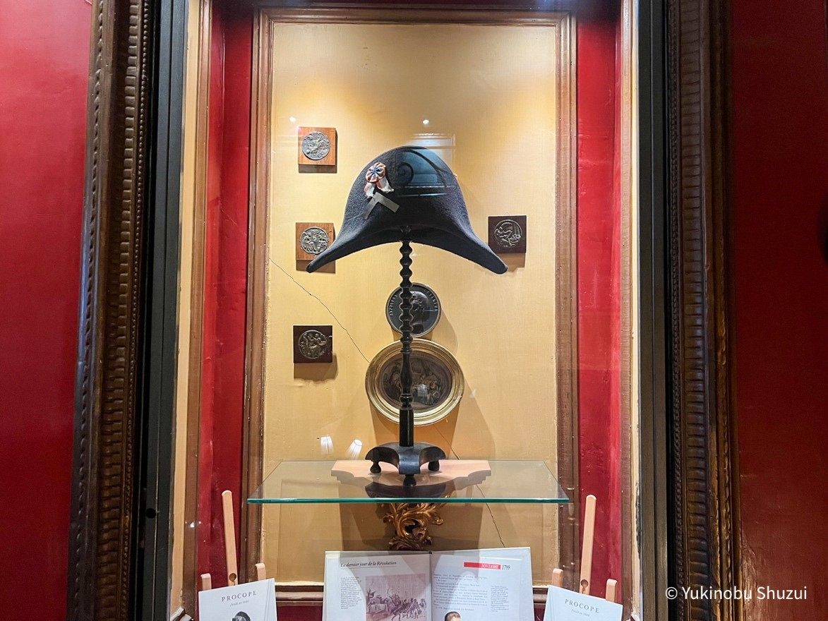 ル・プロコープは豪華な内装で、当時多くの人を集めました。18世紀には作家やジャーナリストたちが集う店になっており、ナポレオンも訪れたそうです。店内の階段を上がった2階には、当時ナポレオンが勘定代わりに置いていったといわれている帽子が今も残され、飾られています。