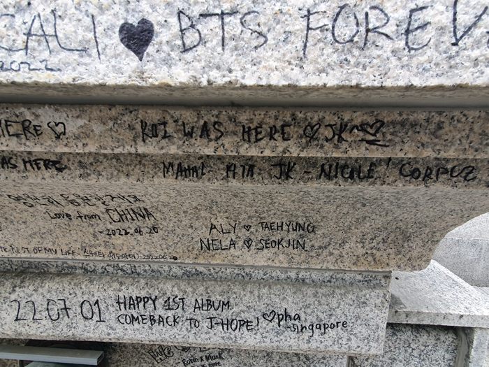 このビルの外壁には、世界中から訪れたARMYたちによって書かれたBTSへのメッセージが今もそのまま残されています。
