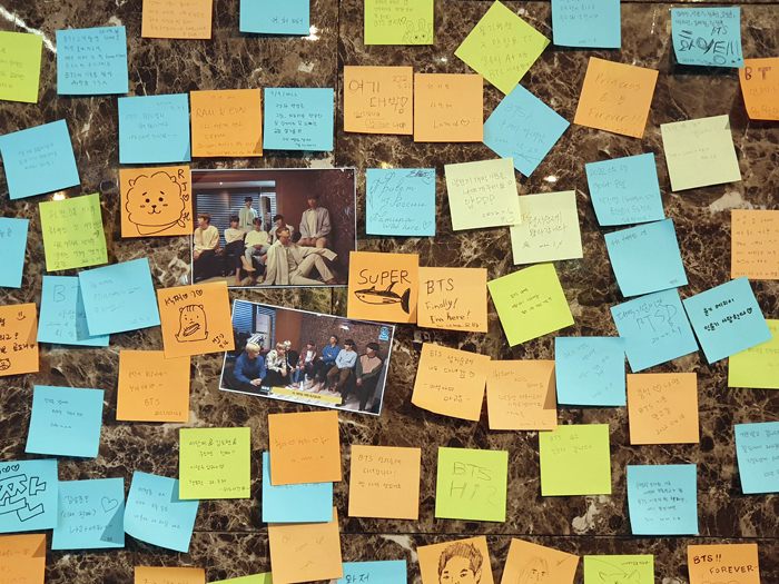 写真に写っている壁を見ると、カフェの内壁と同じなので、実際にメンバーがここにいたとすぐにわかります。ARMYのために、ふせんとペンが置かれているのもうれしいポイントです。