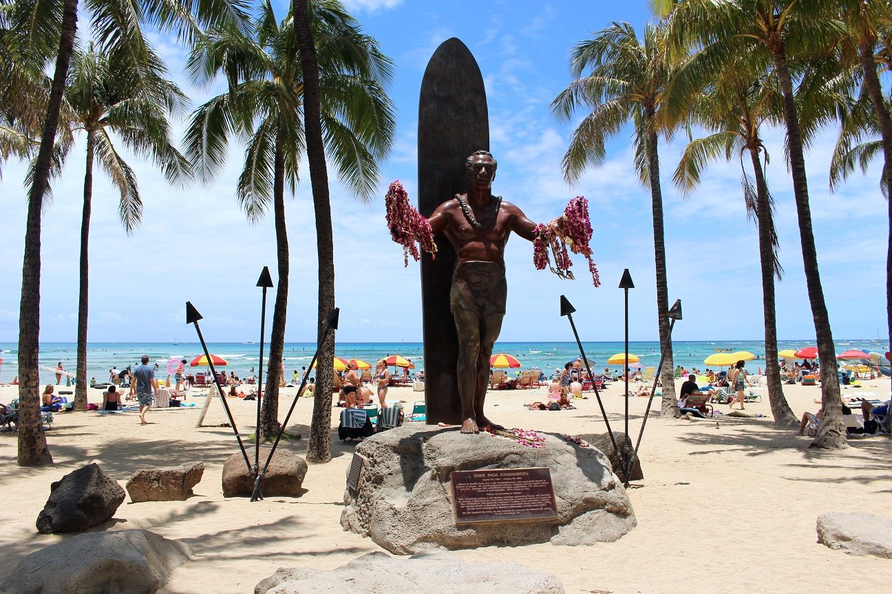 続いて、ワイキキ・ビーチの中でも絶景の撮影ポイントとして親しまれているデューク・カハナモクの像。彼についても、このようなエピソードがあります。1890年にオアフ島に生まれたデューク・カハナモクは、小さい頃から海を遊び場に水泳やカヌーそしてサーフィンをして育ち、10代の頃にはワイキキ・ビーチでさまざまな雑用をこなすビーチボーイとして働いていました。1912年にはストックホルムで開催されたオリンピックの男子100m自由形で金メダルを獲得。世界記録も樹立し、大活躍しました。引退後には、サーフィンと水泳の振興に努め、ハリウッド映画にも出演しています。ハワイ王族が楽しんだサーフィンを世界に知らしめ、アメリカで流行させ、また大会のアイコンとしてサーフィンをプロスポーツにまで押し上げたことで「サーフィンの神様」と呼ばれています。