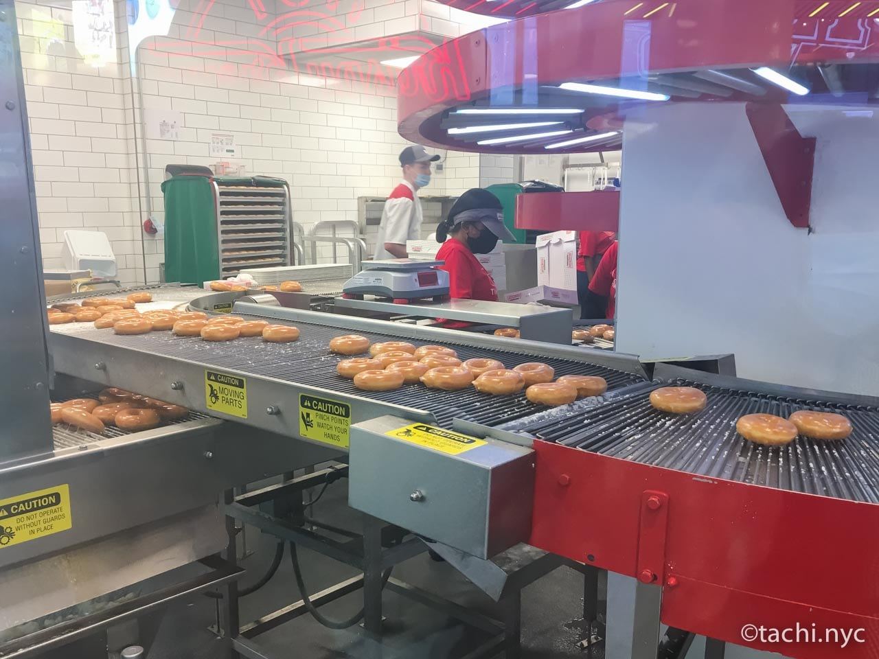 タイムズスクエア観光中、小腹が空いた時におすすめなのが、ブロードウェイ48丁目にあるクリスピー・クリーム・ドーナツの世界最大規模のストア。店内でドーナツを作っているので、出来立てが食べられます。オリジナルグレーズドはもちろん、ニューヨークチーズケーキ味や季節限定のフレーバーもあり、どれを食べようか迷ってしまいます。名物は真っ赤なりんごを模した「ビッグ・アップル・ドーナツ(The Big Apple Doughnut)」(箱入り限定品。1個約11ドル)。