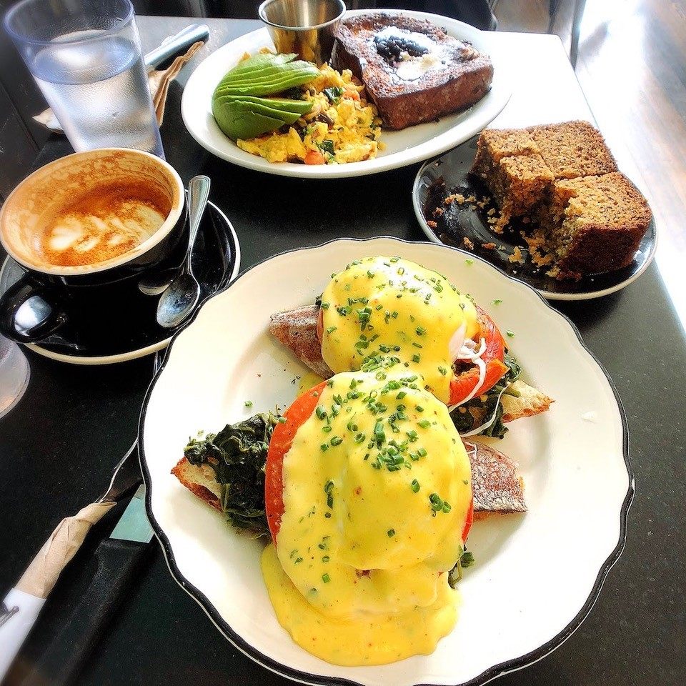アメリカのブランチメニューに欠かせない「エッグ・ベネディクト」もおすすめしたいカフェメニューです。トーストしたイングリッシュマフィンやバゲットの上にハムなどの具材とポーチドエッグを重ね、上からオランデーズソース(バター、レモン果汁、卵黄を使用して乳化し、塩と黒コショウで味つけしたもの)がかけられています。この濃厚なソースととろりとしたポーチドエッグは、イングリッシュマフィンの香ばしさと絶妙にマッチします。