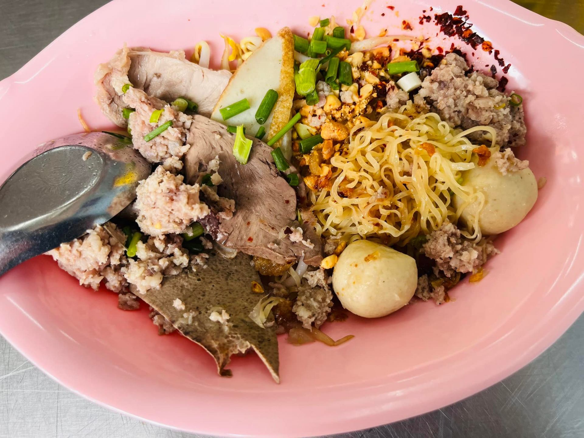 2杯目に注文したのは、汁なしトムヤム、バミー、具材ミックスの組み合わせ(60バーツ、約230円)。こちらはややピリ辛です。