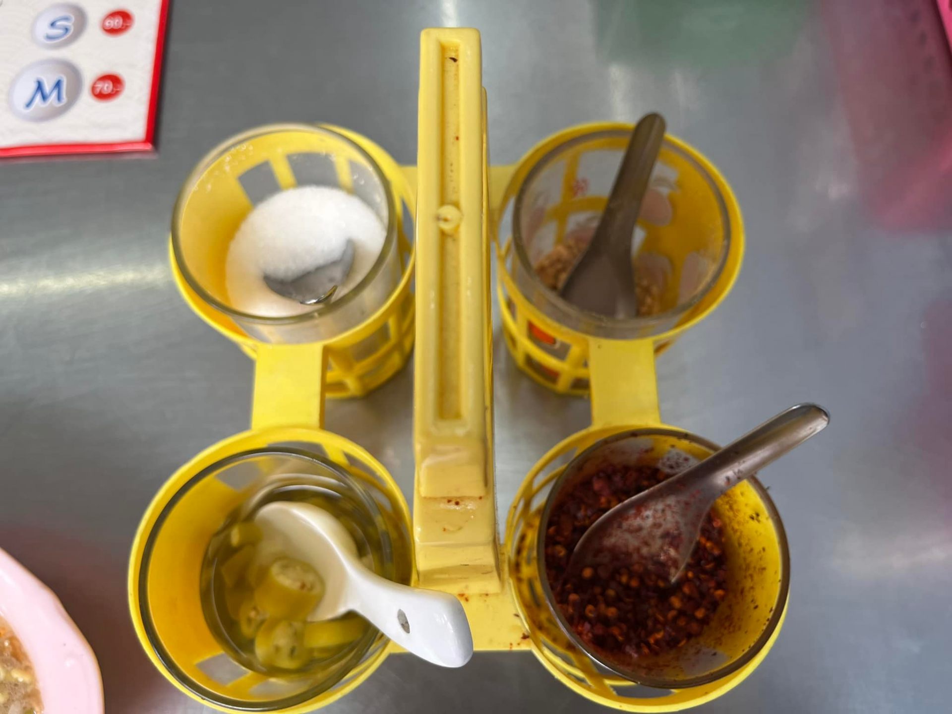 味がもの足りなければ、卓上調味料で自分好みに調整しましょう。たいていのタイの食堂では砂糖(ナムターン)、唐辛子入りの酢(ナムソム)、魚醤(ナンプラー)、粉唐辛子(プリックポン)の4種類が用意されています。砂糖でまろやかさを、酢で酸味を、ナンプラーでうま味を、唐辛子で辛みを加えることができますよ。