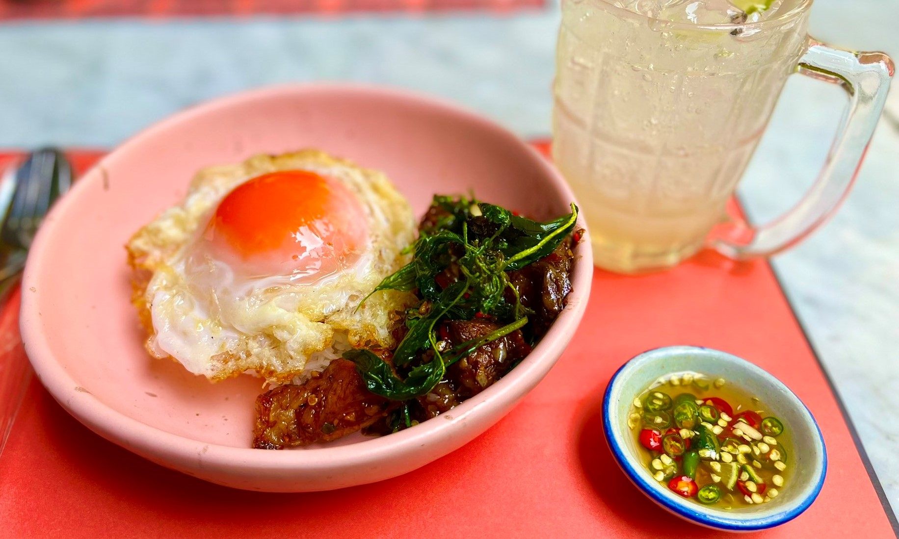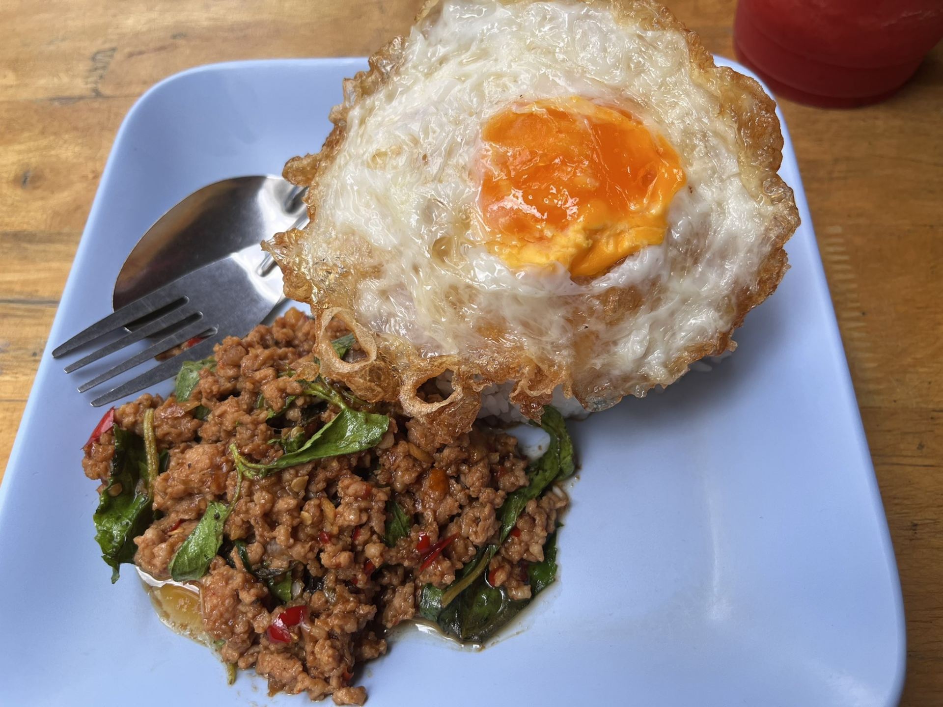 この店のガパオライス(豚肉のバジル炒めごはん)は目玉焼きのトッピング付きです(60バーツ、約230円)。バジルのスパイシーな香りがただよい、濃いめの味付けでご飯が進みます。唐辛子の量はわりと多め。調味料で好みの味に調整しましょう。食べ方のマナーはとくにありませんが、ご飯と具をごちゃまぜにせず、目玉焼きを崩しながら食べるタイ人が多いようです。