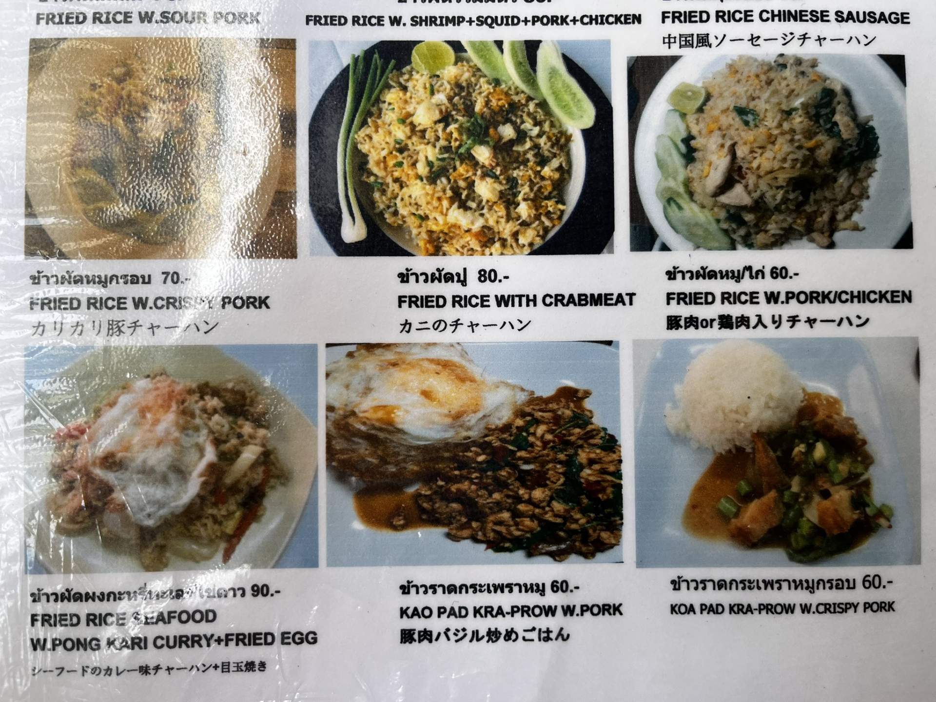 プロンポン駅前の大衆食堂「イムチャン」では、安定感があるおいしいガパオライスが食べられます。150種類以上の豊富なメニュー表は、日本語表記と写真付きで安心です。都心の駅近にも関わらず、ローカル価格なのも嬉しいポイントです。