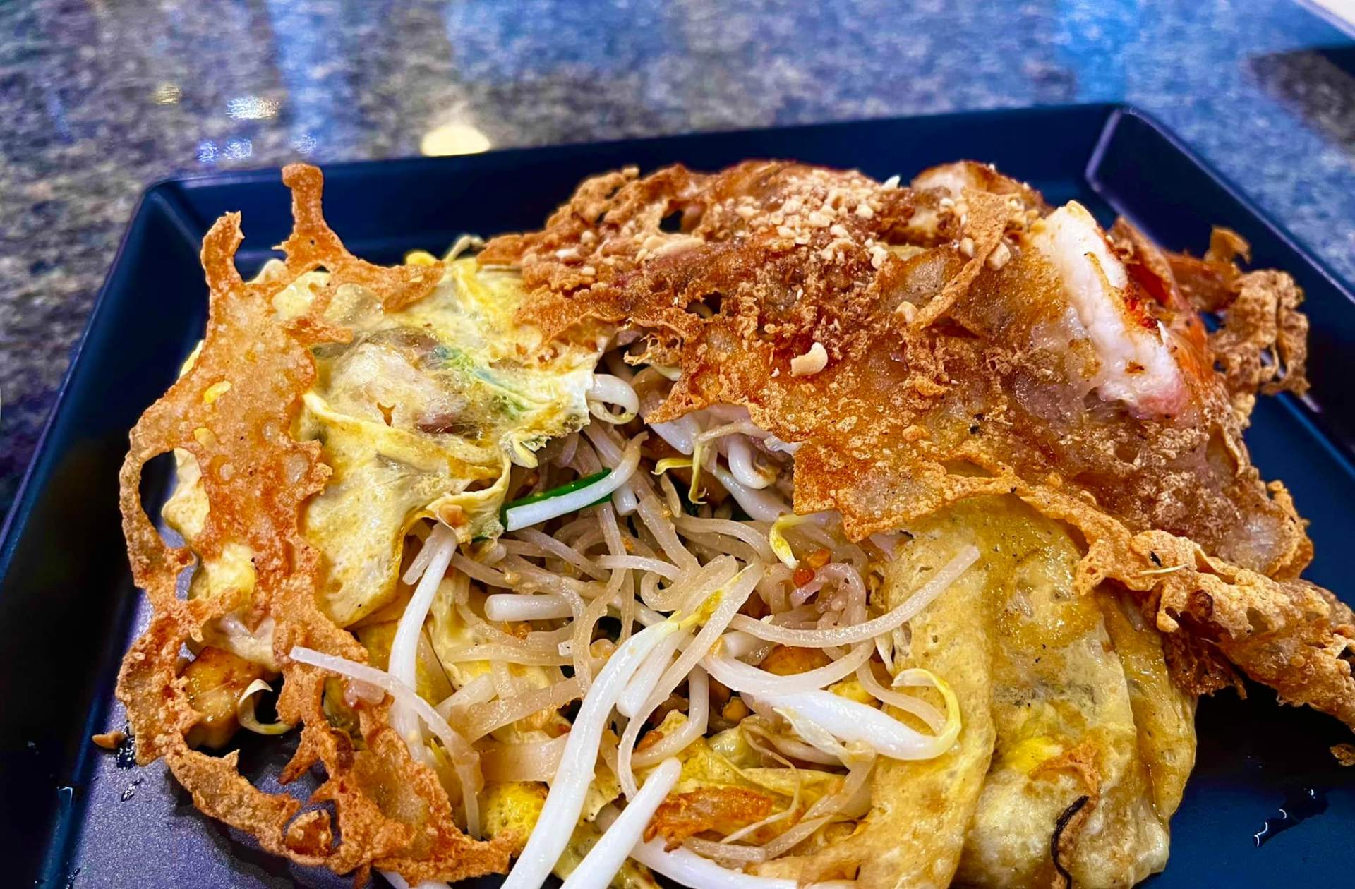 この店のパッタイは薄焼き卵で包まれているのが特徴です。プリプリのエビがトッピングされた「エビ入りパッタイ」は100バーツ(約380円)。甘すぎず優しい味付けで、シャキシャキしたモヤシともっちり麺との相性が抜群です。