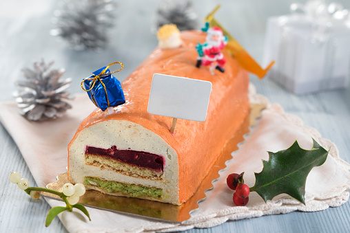 日本でもよく見かけるブッシュ・ド・ノエルは、フランスの定番クリスマスケーキ。フランス語で「クリスマスの丸太(薪)」を意味するように、ロールケーキにチョコレートクリームを塗って丸太に見立て、表面にフォークなどで木の模様をつけたものが伝統的なスタイルです。なぜ“丸太”なのかについては諸説ありますが、キリストの誕生を祝って夜通し薪を燃やし続けたからとも、薪を燃やして翌年の「無病息災」を願う北欧の「ユール(冬至祭)」に由来するともいわれています。