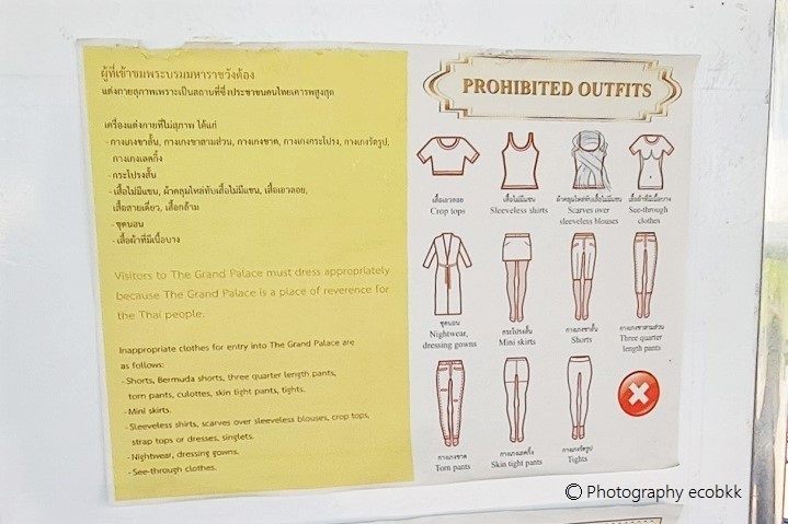 ワット・プラケオに限らず、タイの寺院では基本的にノースリーブやミニスカート、短パン姿では入場できませんので、ご注意ください。襟付きのシャツに足先近くまで隠れるズボンやスカートで、なおかつ、体のラインが分かりにくい服装で行くようにしましょう。