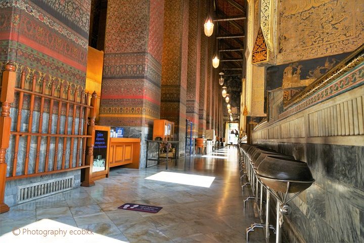 礼拝堂の廊下には、108の鉢がずらりと並べられています。並んだ鉢の中に少しずつ硬貨を喜捨していくことで、煩悩が消えていくと考えられています。硬貨は、礼拝堂の入口で購入することができます(20バーツ、約75円)。ワット・ポーを訪れたらぜひ体験してみましょう。