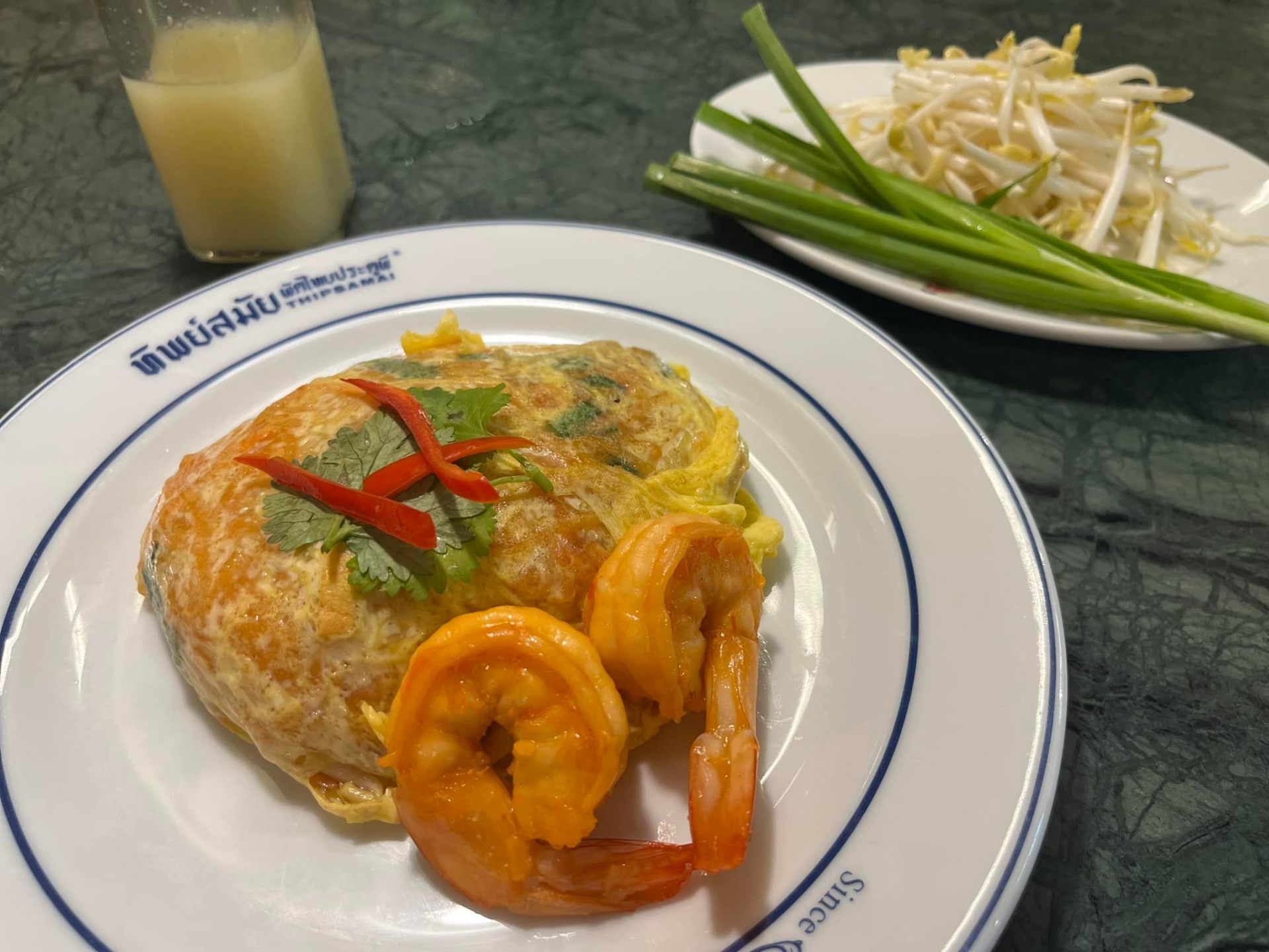 看板メニューの「卵包みパッタイ」(150バーツ、約570円)には、プリプリのエビが2匹添えられています。