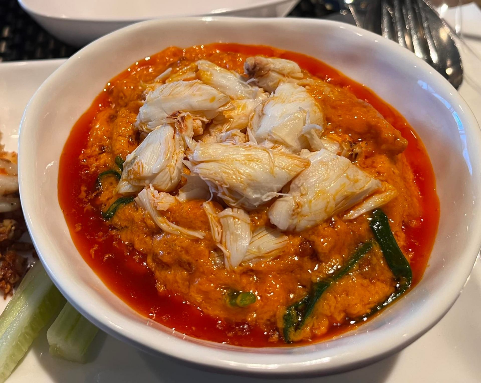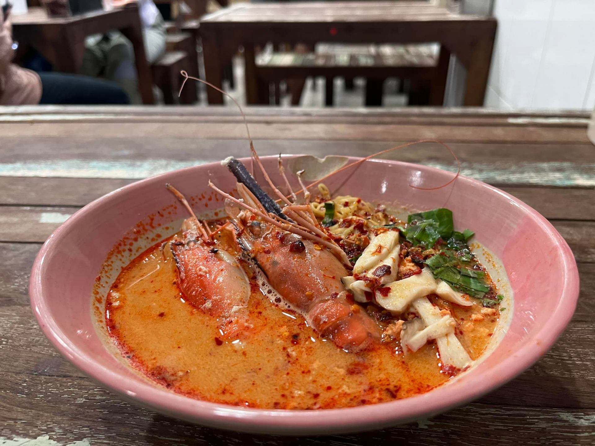 大ぶりの手長エビが2匹のっています。殻を剥いて、プリプリの身をガブリといただきましょう! スープは辛さ控えめで、濃厚なエビのうま味が溶け込んだ奥深いコクがあります。最後まで飲み干したくなるおいしさです。