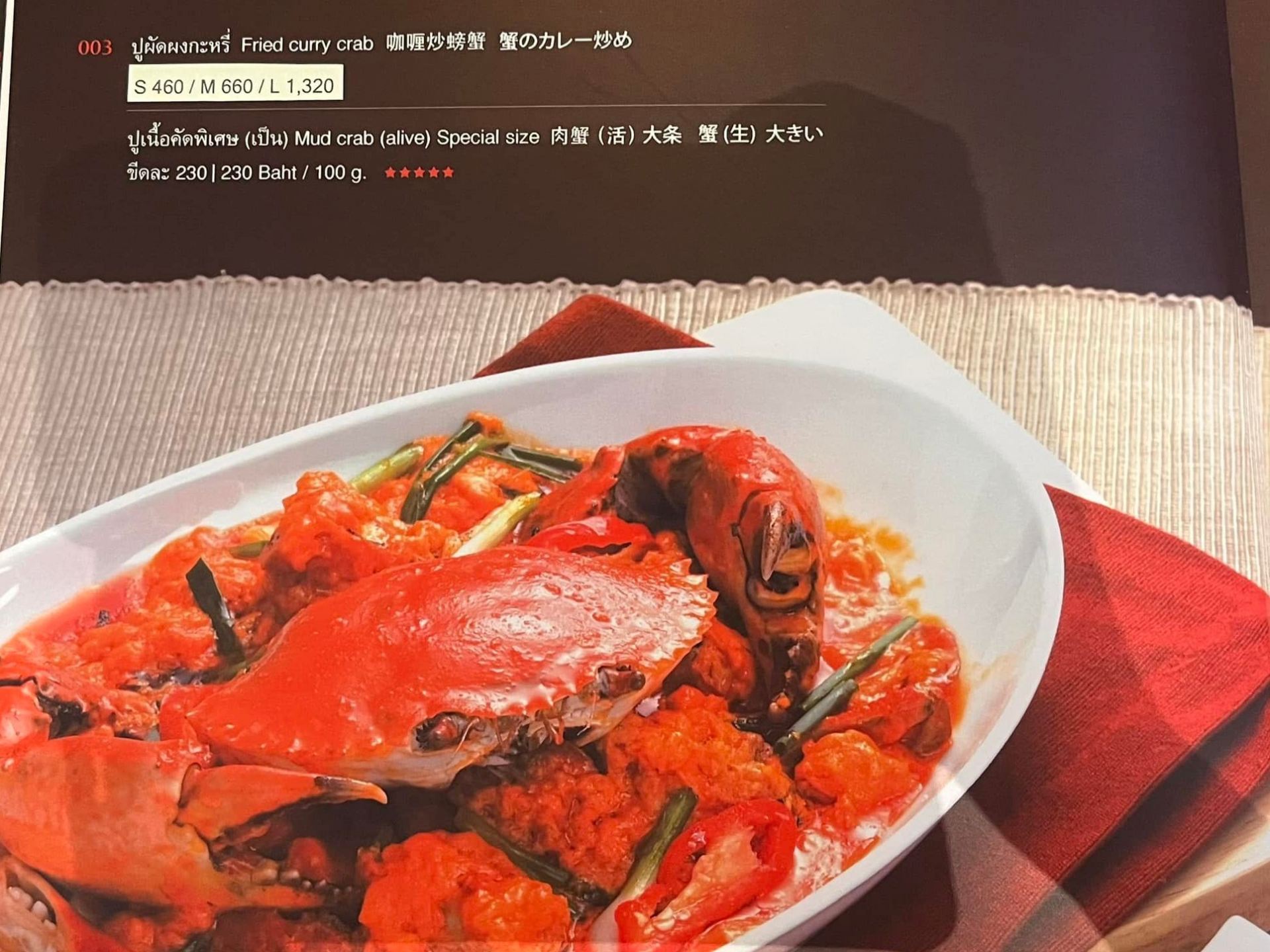筆者が訪れたのは、バンコクの高級デパート「セントラル・エンバシー」5階にある店舗です。メニューには日本語表記があり、プーパッポンカリーのページには「蟹のカレー炒め」と書かれています。Sサイズ「殻付き」は460バーツ(約1750円)、「殻なし」は540バーツ(約2050円)です。