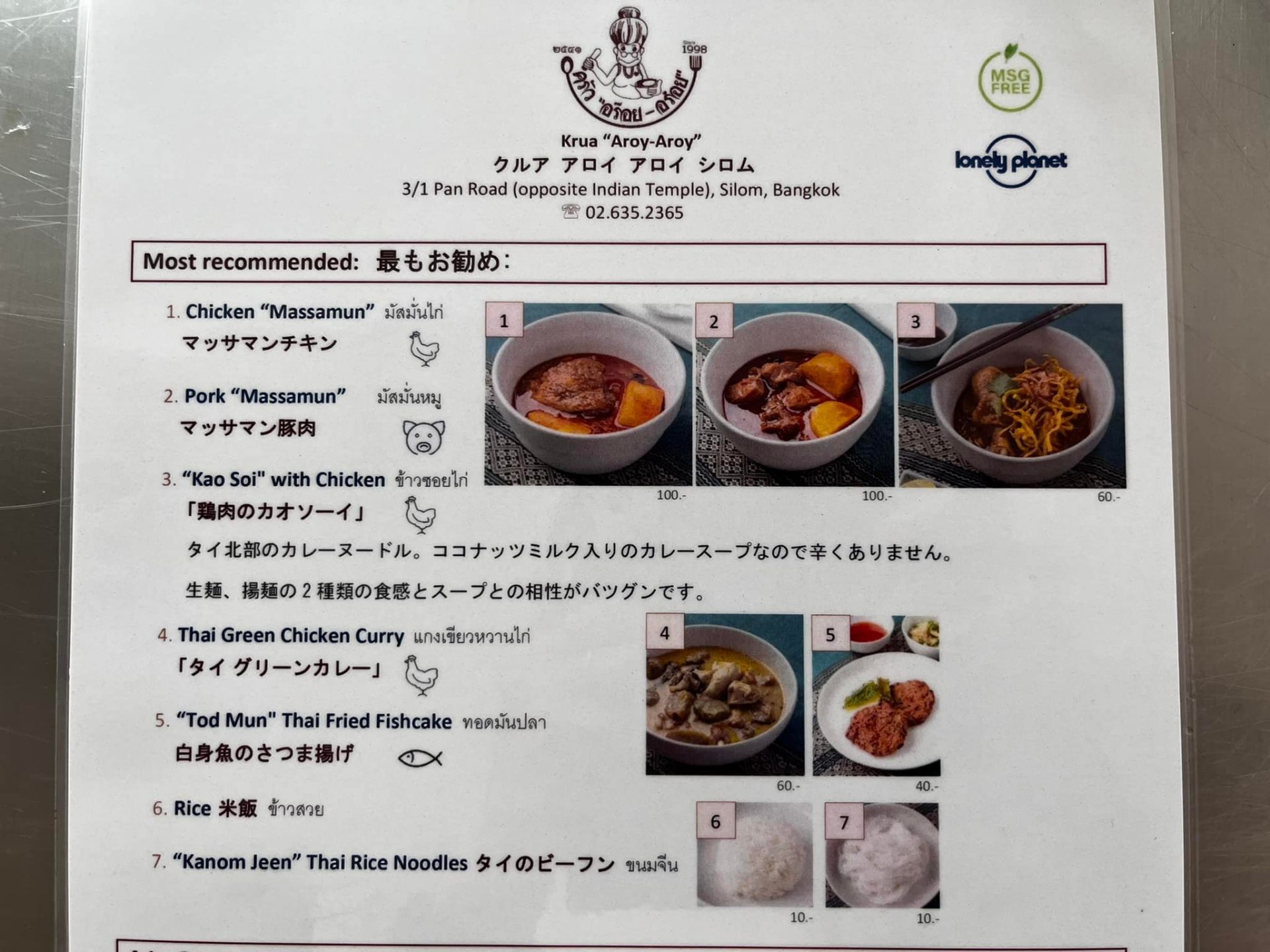 メニューには日本語表記もあります。筆者はマッサマンチキン(100バーツ、約380円)とライス(10バーツ、約40円)を注文しました。