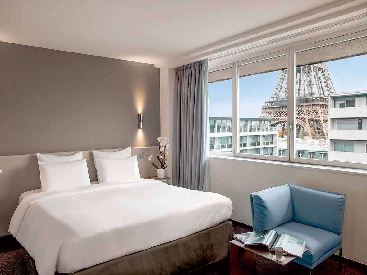 エッフェル塔に近く、ル・ビュス・ディレクトの停留所からもすぐ。旧「ヒルトン・パリ」を改装しビジネスホテルとしてデザインを一新。430室中、半数は庭園を望む部屋となっており、見晴らしがいい。塔の見える部屋もあるのでリクエストを。