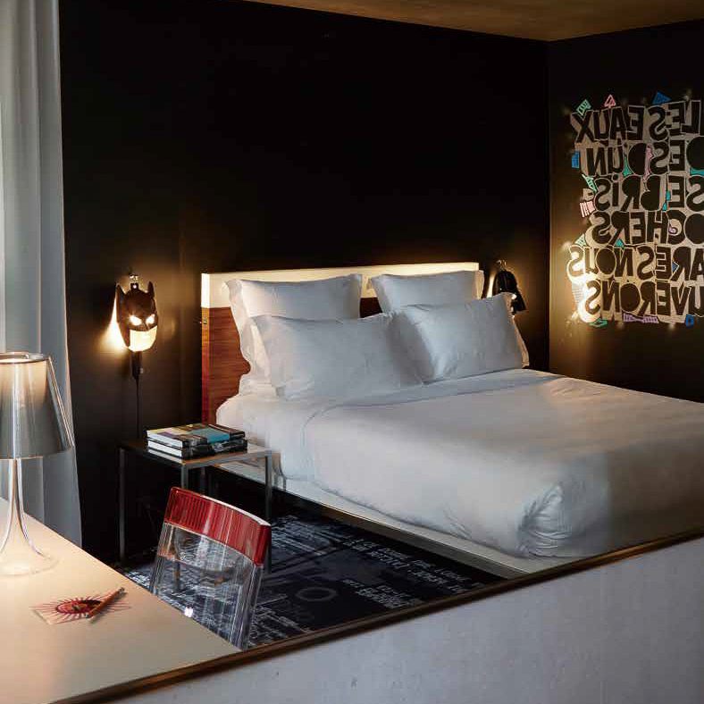 フィリップ・スタルクによる内装デザインは、黒を基調にアニメやストリートアートをちりばめて意表をつく。館内のレストランやバーは、パリっ子たちがこぞって押し寄せる人気スポット。エコサート認証のアメニティにもこだわりが。