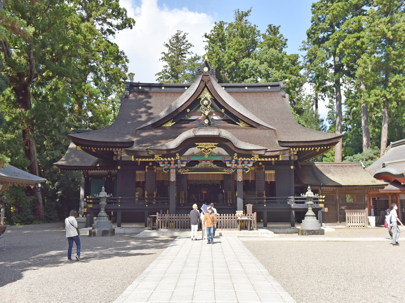 門前の商店街をぬけ、森のなかを緩やかに上る参道をぬけると現れる朱塗りの楼門。参道を歩くのは7~8分ほどですが、清浄な空間を通る間に気持ちが落ち着いてくるのがわかります。一礼して楼門をくぐって境内に入ると、正面に黒漆塗り、檜皮葺の屋根をもつ拝殿があり、右手にひときわ高い梢を見せる御神木が立っています。境内にはほかにも杉の巨木がいくつもあり、周辺の森を含めて県の天然記念物に指定されています。参拝のあとはゆっくり境内を巡って、千葉県随一の古社のパワーを全身で感じてみましょう。
