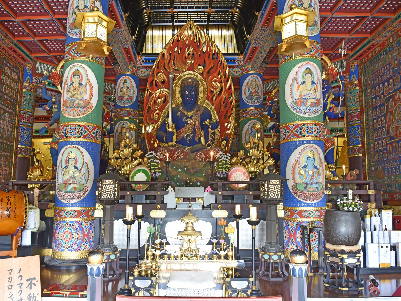 新勝寺のご本尊は不動明王。大本堂にお祀りされたそれは、弘法大師空海が自ら敬刻開眼したいわれています。そのご本尊を見ることはできませんが、境内にあるいくつかの伽藍のうち、高さ58mで最も高い建物である平和大塔の不動明王には対面することができます。重要文化財に指定されている釈迦堂や三重塔など、境内には訪れるべきポイントがいっぱいあります。境内のいくつものお堂で、全部で6種類の御朱印をいただくことができるで、御朱印を受けながら境内を散歩するのもいいでしょう。