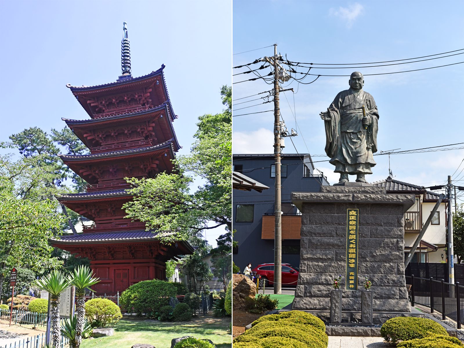 石畳の参道を進むと正面に見えてくるのが五重塔。渋い朱色(弁柄塗り)が印象的な建物で、国指定の重要文化財に指定されています。このほかにも祖師堂、四足門、法華堂が重要文化財。山門横にある日蓮聖人像、祖師堂のとなりにある日常上人像、高さ3.6mの大仏像など、見るべきスポットが多数あります。