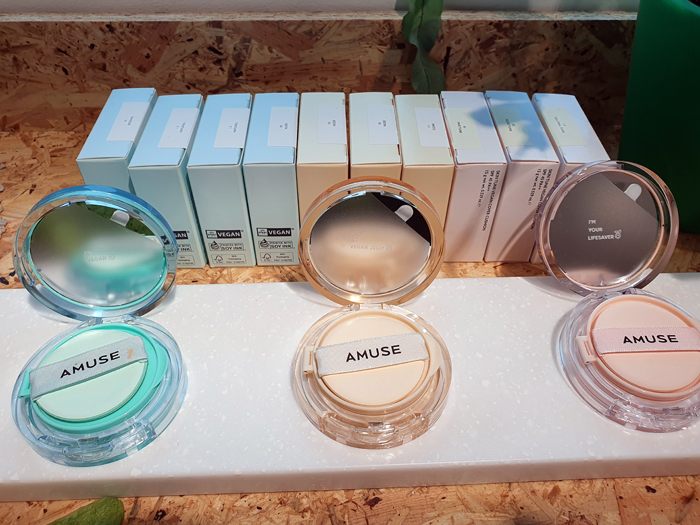 クッションは、ヴィーガンコスメでありながら24時間しっかりと肌に密着する「メタフィットクッション」(写真左)と、透明感のあるふわモチ肌に仕上げてくれる、肌にやさしい「デュージェリーヴィーガンクッション」(写真中央)、そしてしっかり毛穴をカバーしてくれ、かつ透明感のある「スキンチューンヴィーガンカバークッション」(各3万4000ウォン、約3400円)が販売されています。