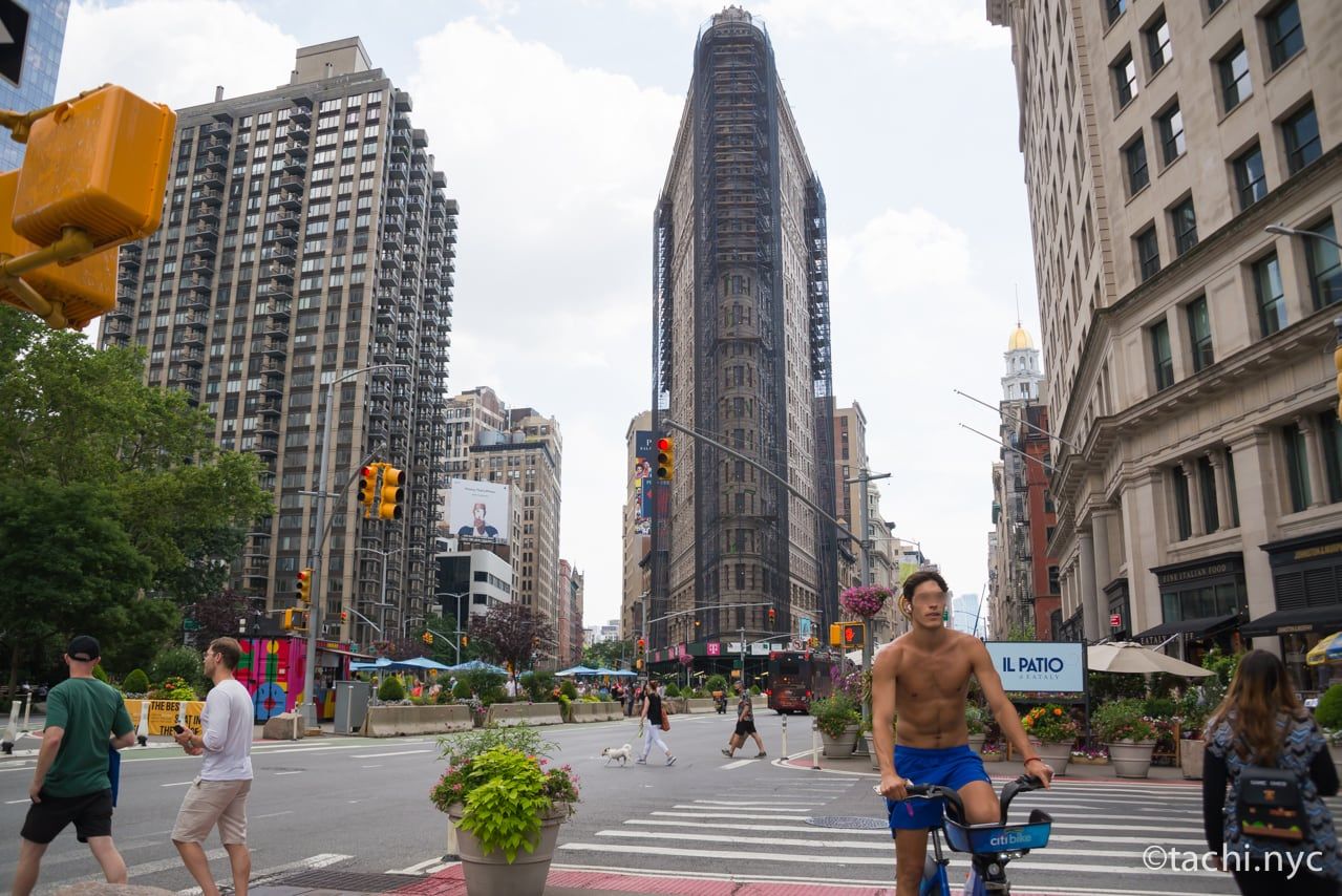 ハリー・ポッター・ストアを出て北へ1分ほど歩くと「フラットアイアン・ビル」が現れます。フラットアイアン・ビルはニューヨーク市内ではじめて建てられた鉄骨造りのビルで、シカゴの有名建築家ダニエル・バーナムが設計しました。完成は1902年で、ニューヨークの歴史ある象徴のひとつです。