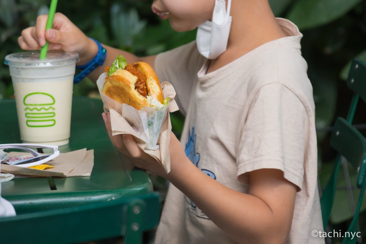 子供と一緒に観光していると、どこでランチをすればいいか迷ってしまう方もいるかもしれません。筆者のおすすめは、ニューヨーク発のハンバーガー「シェイク・シャック」のマディソンスクエア・パーク店。日本でも人気が高い「シェイク・シャック」の1号店で、きれいに整備された公園内にあり開放的で、テーブルと椅子がたくさんあるので子供連れのランチにぴったり。