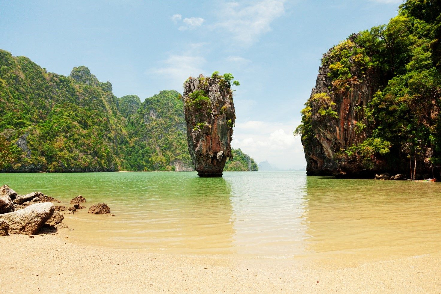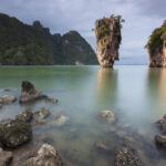 プーケットの北東にあるパンガー湾には、161もの小島があります。石灰岩が浸食されて奇妙な形に削られており、なかでもピンカン島にはくさびを海に打ち込んだかのような形の岩があり、映画『007 黄金銃を持つ男』で登場し、有名になりました。