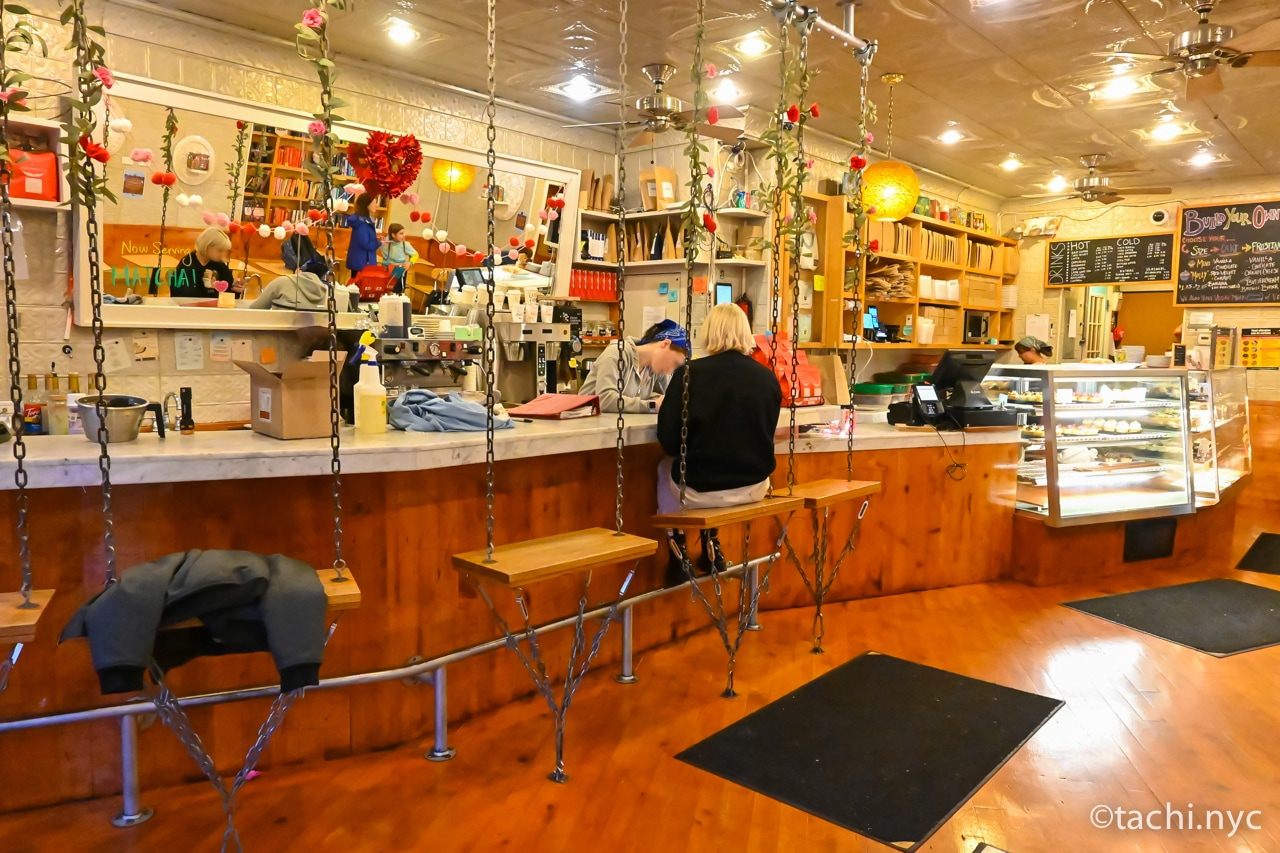 ウエストビレッジの店舗はパッと目立つ明るい黄色の外観で、店に入る前からワクワク。店内にはブランコ席があり、女性や子供に喜ばれそう。実際に、学校帰りの子供を連れた母親と思われる人がカップケーキを購入していました。