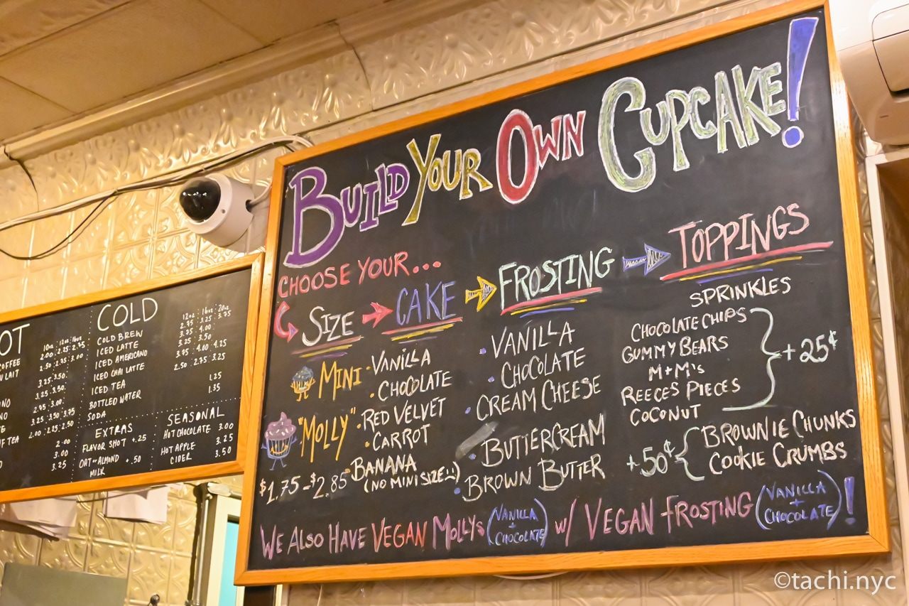種類豊富なカップケーキはイラスト付きの説明書きが添えてあるので、じっくり読みながら選べるのがうれしいところ。ショーケースに並んでいるもののほか、サイズ、生地、トッピングを選んで「自分だけのカップケーキ」を作ってもらうこともできます。
