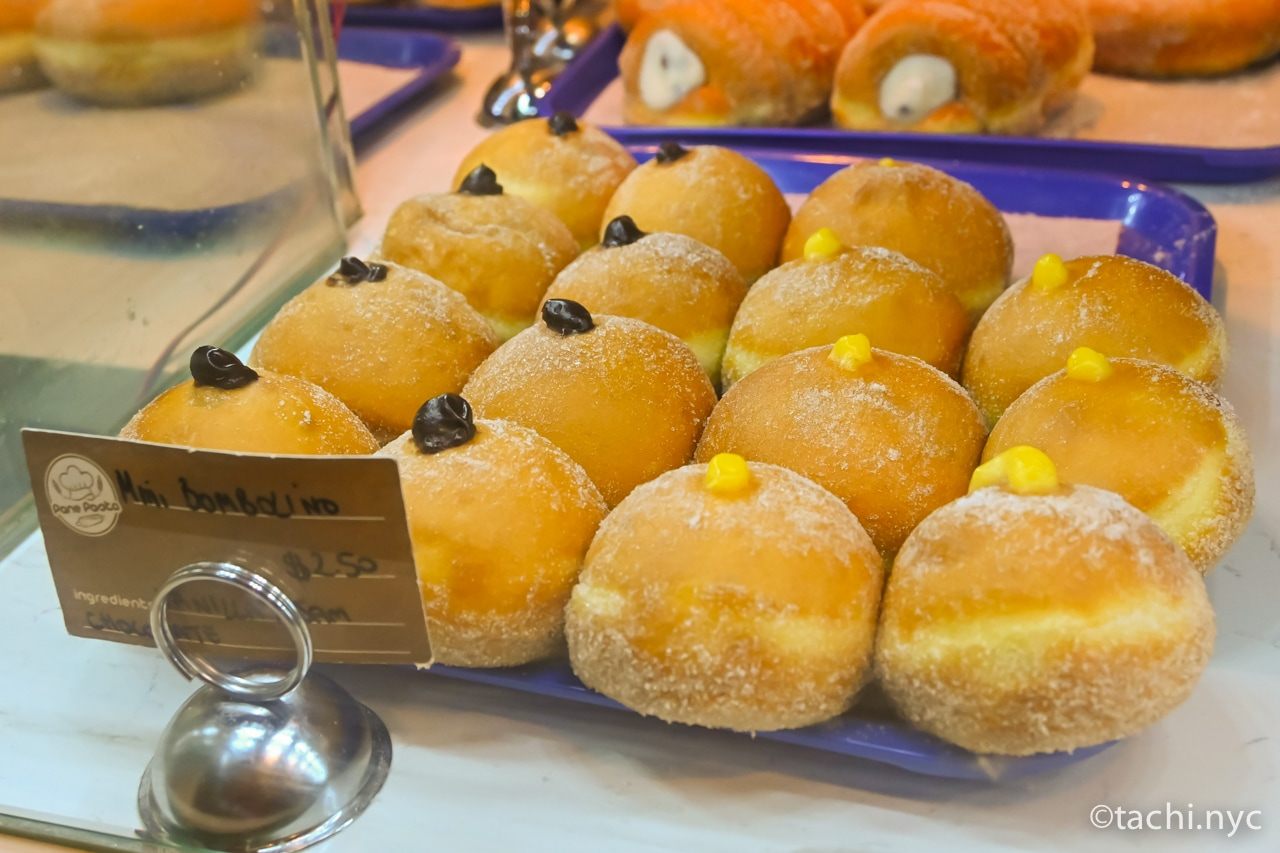 筆者のいち押しは、ニューヨークで流行中の「ボンボローニ」。ミニサイズを買いましたが十分な大きさで、レギュラーサイズだと巨大だと感じるほど。バニラ・クリームまたはチョコレート・クリームがたっぷりと詰まっており、パン生地はふかふか。揚げてあるものの油臭さがなく、食べたあともさっぱりして、胃が重くなる感じがありません。バニラ・クリームにはレモンが入っており、柑橘系の酸味が口をさっぱりさせ、後味はスッキリしています。