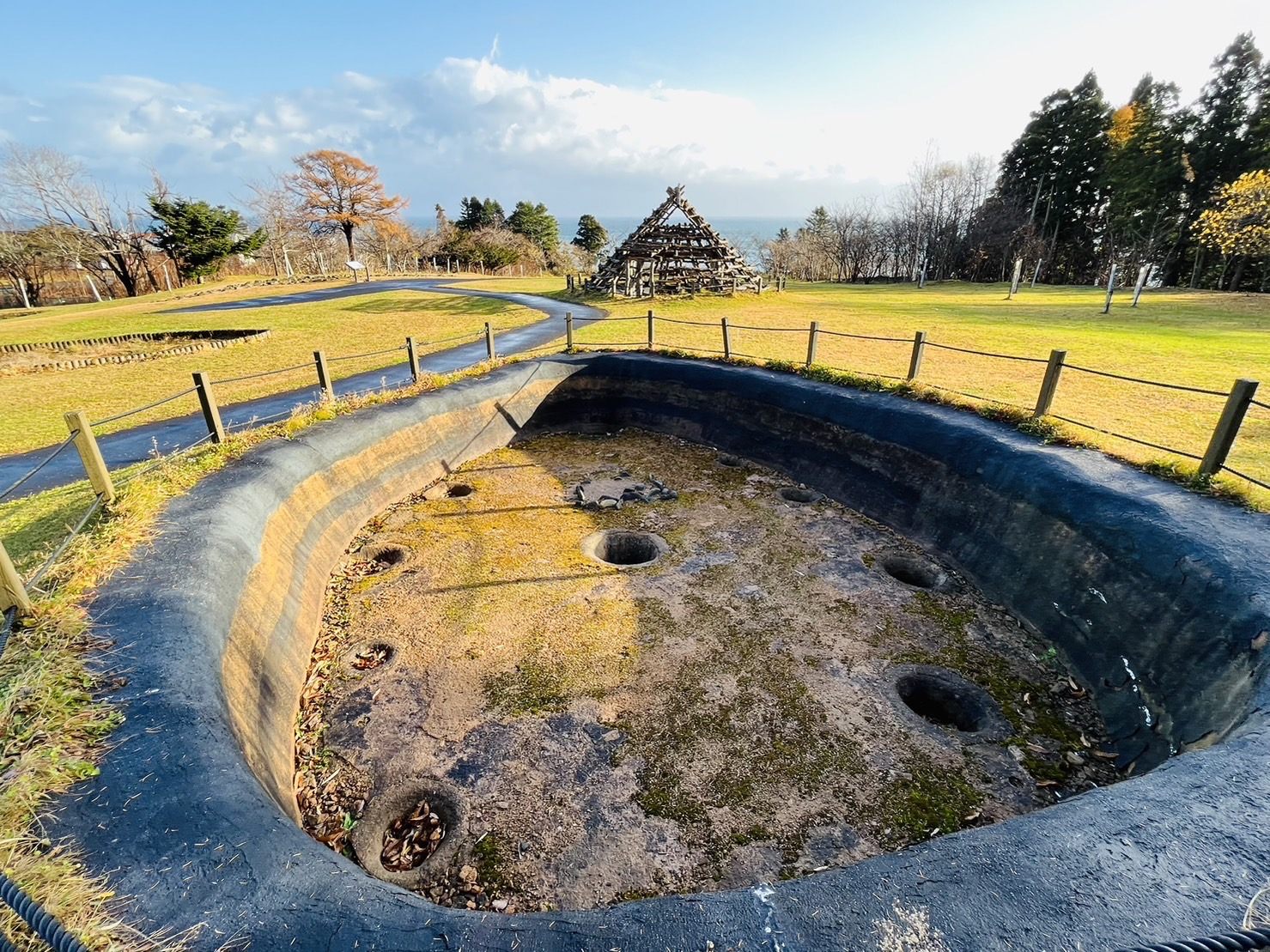 世界遺産「北海道・北東北の縄文遺産群」の構成資産のひとつ。森の中を行くと、土を盛り上げて造ったドーナツ状の周堤が見られます。この中に複数の墓が配置されていたそう。