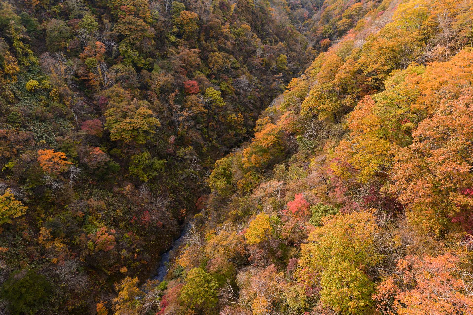 しかべ間歇泉公園から噴火湾沿いにロングドライブ。登別温泉に向かう途中にある全長240mの新登別大橋は紅葉の絶景スポット。紅葉に彩られる渓谷と、遙か下を流れる登別川が見下ろせます。
