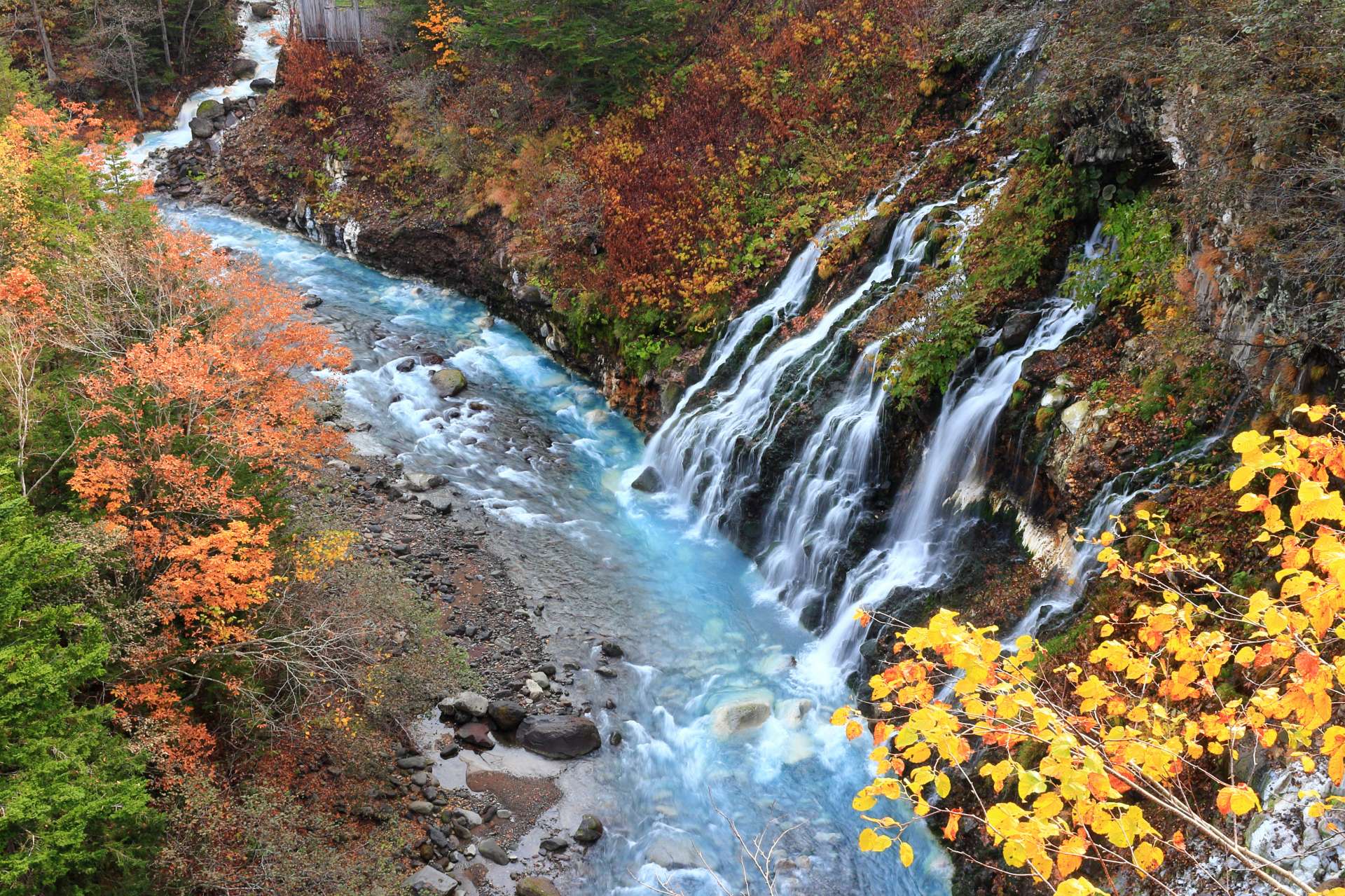 青い池の上流、白金温泉にある滝で断崖の割れ目から水が染み出しています。この滝に含まれる火山性物質が美瑛川に流れ込み、青い池の美しいコバルトブルーを生み出しているのだそう。自然の神秘を感じます。
