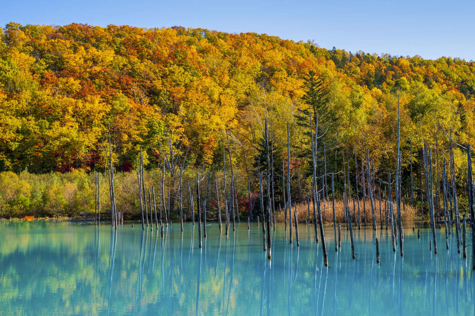 美瑛の必見スポット、白金 青い池へ。十勝岳の火砕流を防ぐために造られた堰堤に美瑛川の水が溜まってできた池で、水に含まれる成分が太陽に反射して青く輝くのだそう。秋は紅葉がより青を際立たせ、うっとりする美しさ。