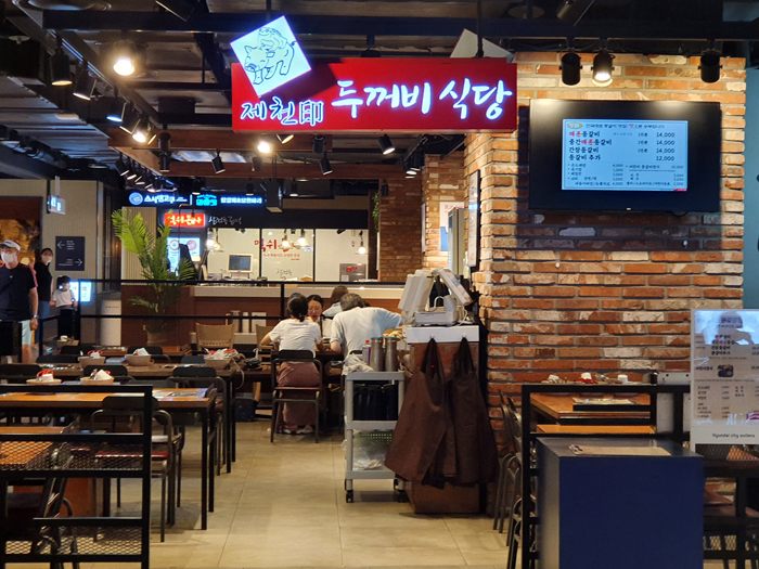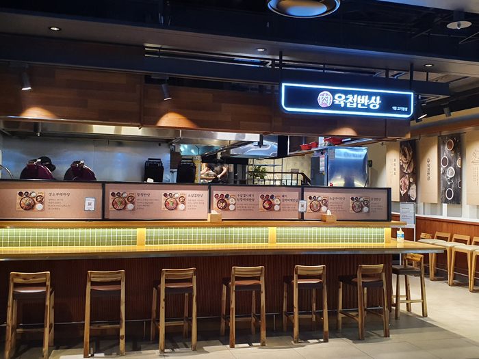 地上9階もレストラン街になっていますが、筆者いち押しは地下2階のフードコートエリア。フードコートをはじめ約30店舗の飲食店があり、ひとりでも肉料理が食べられる肉貼飯床(ユッチョッパンサン)やバックリブ料理で有名なトゥコビ食堂、アワビ料理が食べられる済州(チェジュ)オチョンボクなどいろいろな飲食店が並んでいます。