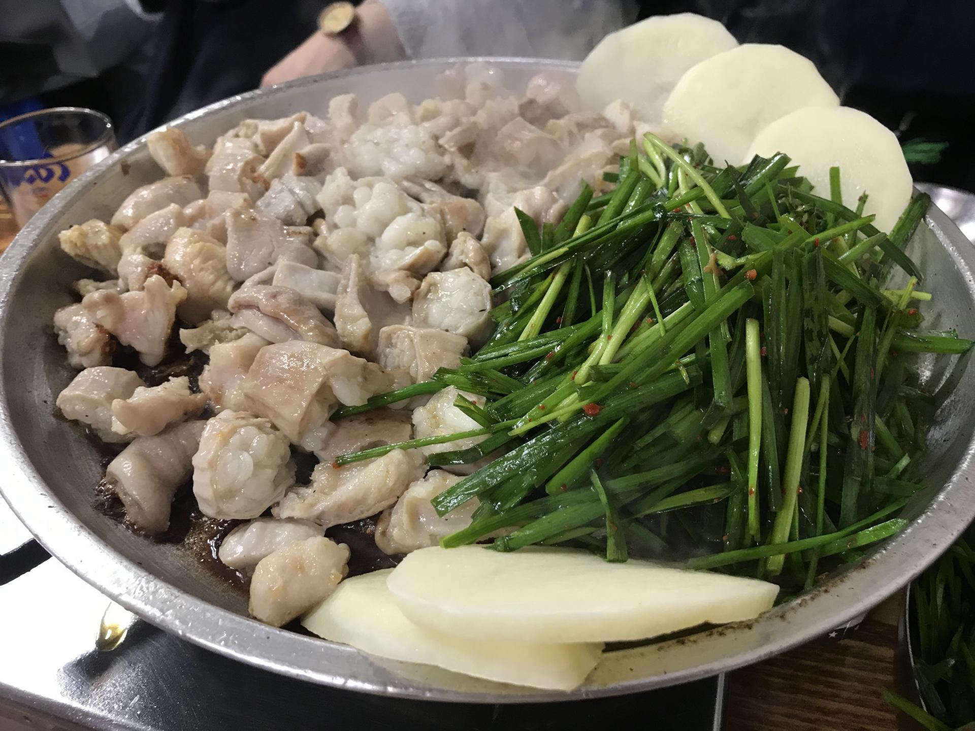 タッカンマリ(닭한마리)は、たらいのように大きな鍋に鶏のぶつ切りとネギ、細長い韓国餅、じゃがいもを入れて煮込んだ料理。タッカンマリとは韓国語で鶏一羽という意味で、鶏そのもののだしが出て、スープだけでもおいしいです。鍋の具材を薬味とタレにつけて食べます。タレは甘じょっぱく、クセになるおいしさです。