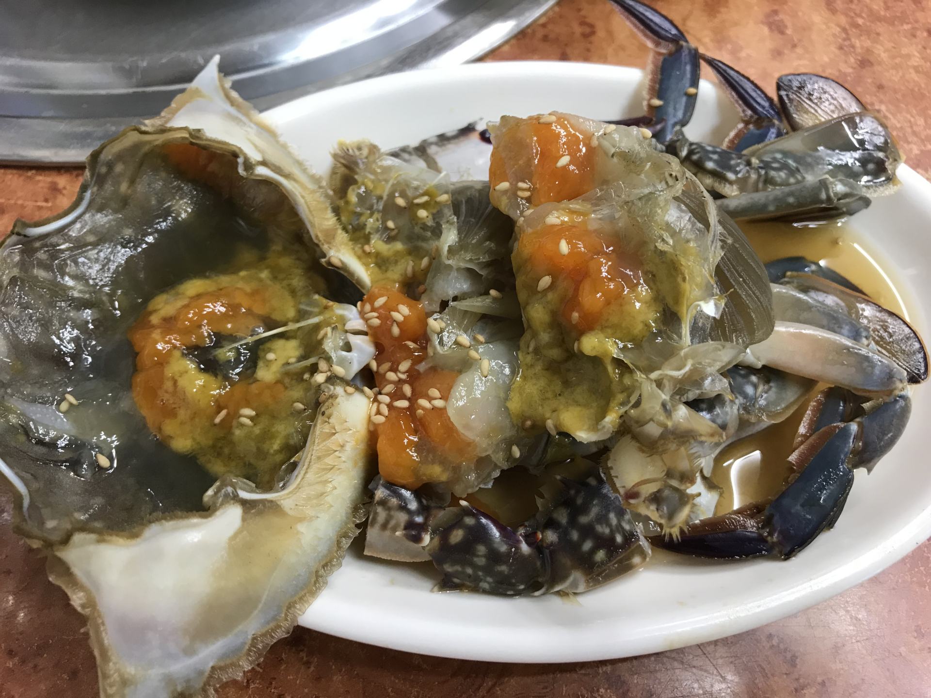 カンジャンケジャン(간장게장)とは醤油に漬けた蟹のことをいいます。カンジャンケジャンで使われる蟹はワタリガニで仁川から近い江華島(カンファド)や全羅南道の麗水(ヨス)が有名です。ソウルでも食べられ、おかずとセットの定食スタイルのお店が人気です。オレンジ色の蟹味噌は甘くて深みがあります。