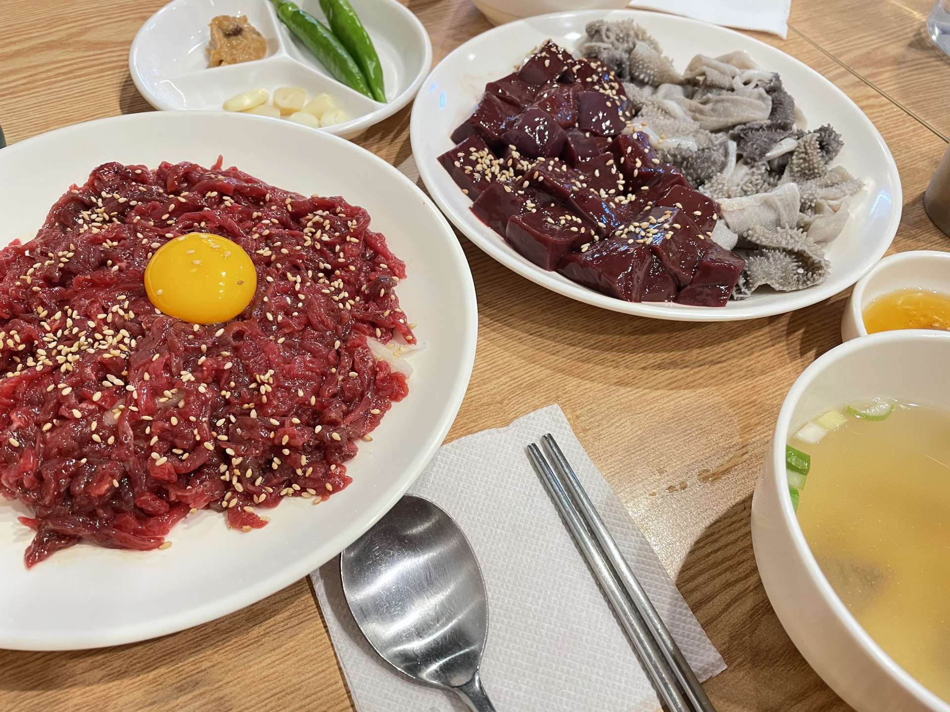 日本では食べるのが難しくなってしまったユッケとレバ刺し。韓国ではユッケ専門店やコプチャン専門店で食べることができます。新鮮なものをすぐに出しているので、臭みはありません。ユッケは梨をスライスしたものと黄身を混ぜて食べます。レバ刺しは塩が入ったゴマダレに付けて食べ、センマイ(牛の第三胃)と一緒に食べることが多いです。ユッケ専門店では牛肉が入ったスープが一緒に出てくるので、お得です。ソウル市内では広蔵市場内に専門店がいくつかあり、いつも賑わっています。