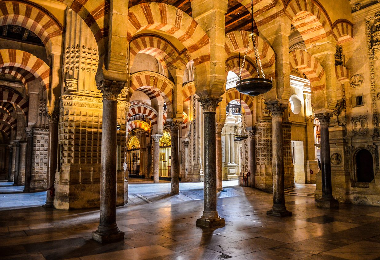 メスキータは現在キリスト教の大聖堂として使われていますが、もとはイスラム寺院でした。キリスト教徒がコルドバを奪回した後に改修されたものの、ミフラーブ(聖地メッカの方向にある壁につくられた窪み)などイスラム様式も残されており、2つの異なる文化が融合したほかに類を見ない寺院です。