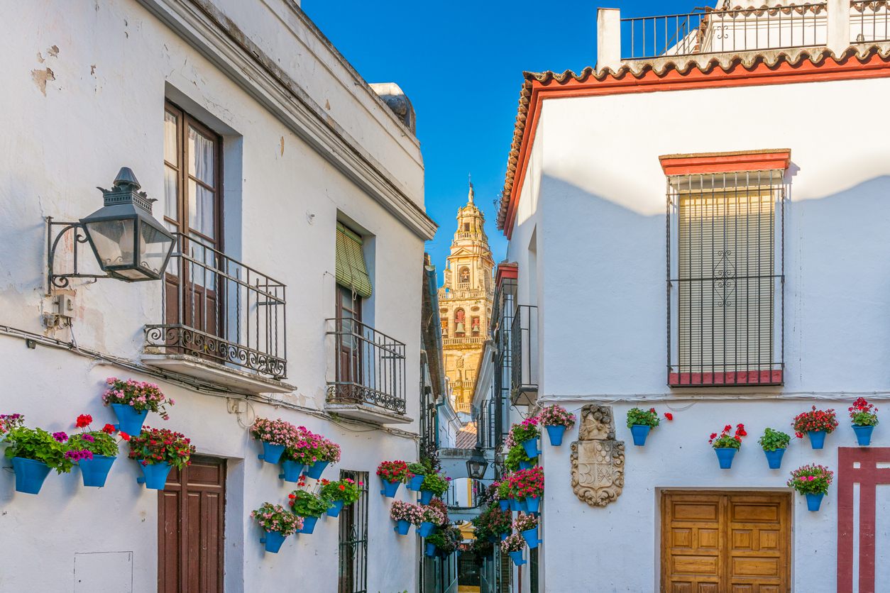 メスキータの周辺には花の鉢を飾った白壁の家が立ち並び、その間を細い道が入り組んだ旧ユダヤ人街があります。バルやレストラン、お土産屋さんが点在しているので、ぜひ散策をお楽しみください。