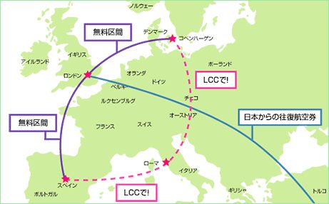 ですので、まずヨーロッパの起点となる都市までレガシー・キャリアの往復便で手配します。この際到着する都市は行きたい都市で、その時期に安い航空券を手配すればよいでしょう。この場合ではロンドンに始めに向かいます。ロンドンに着いたら、マドリッド、ローマ、コペンハーゲンなど行きたい都市をLCCで移動します。もし、ストップオーバーなどが使用可能な航空券で無料区間があるようならそれらも上手に利用しましょう。