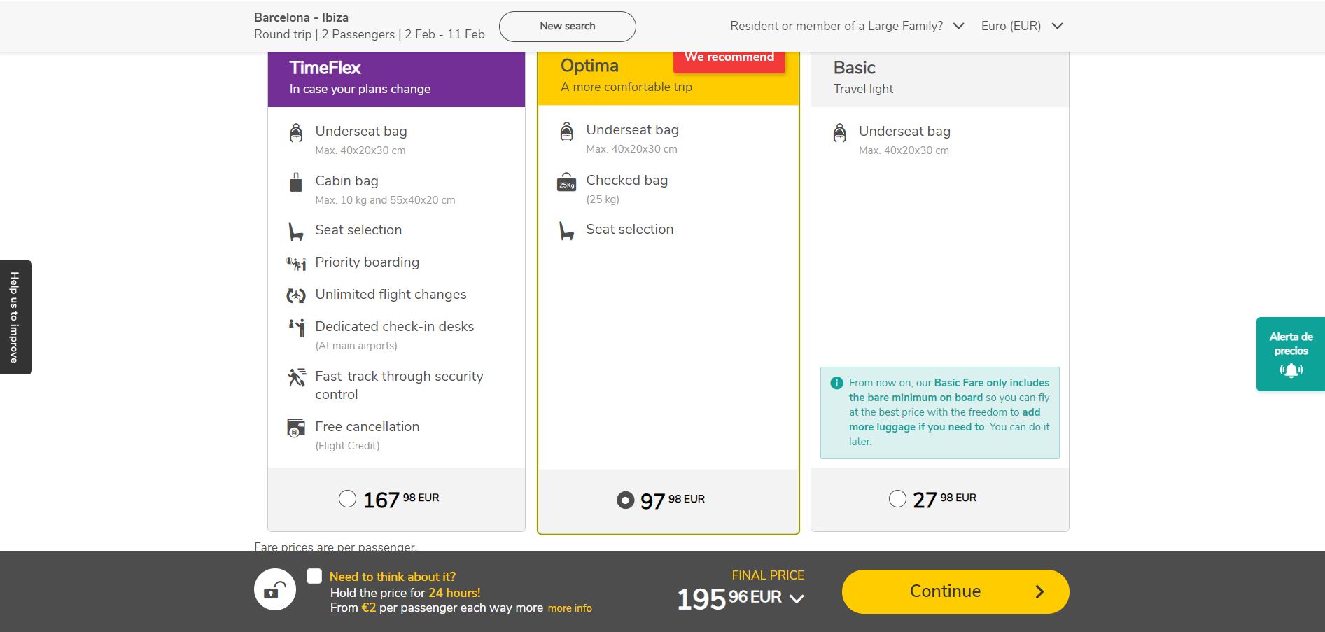 前ページまででも扱ってきたように、LCCは預入れ荷物は有料のケースが多いです。国内で手配するとあらかじめ預入れ手荷物がプランに入って出てくるケースが多いですが、このケースでは預入れ手荷物込みのプランで、往復100ユーロ弱(1ユーロ140円時に14000円)で手配が可能でした。安い…。(画像は2人で手配しているので、195.96ユーロと表示されています)