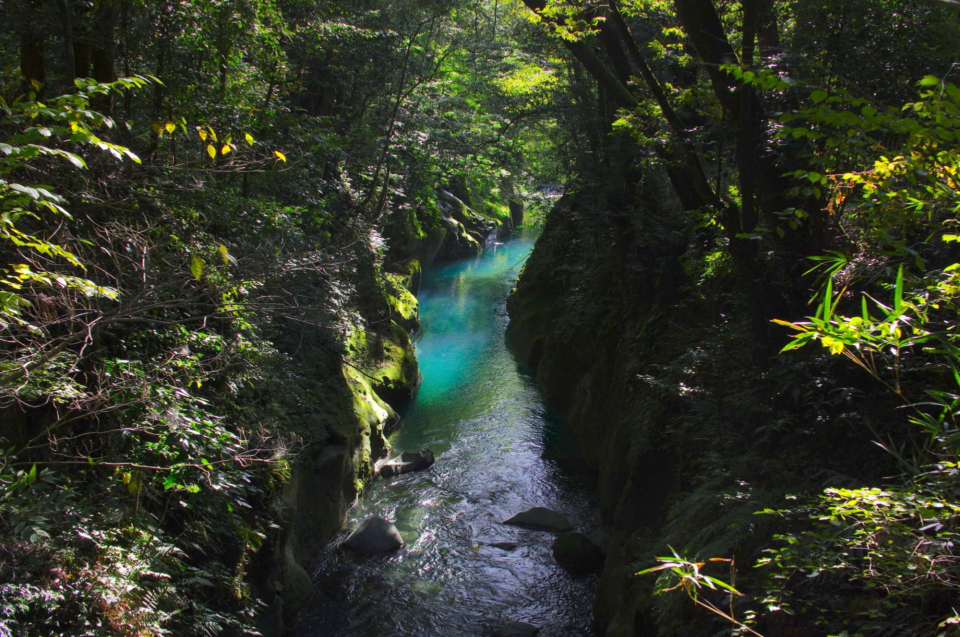 渓谷には幾つかの滝があり、しぶきを立てて流れ落ちる水音と、美しい光景に心癒されます。一方、木々に囲まれた静かな流れの場所では、光と影のバランスによってコバルトブルーの美しい水の色を見られることも。これは、霧島川に流れ込んだ温泉水の成分による現象だそうです。