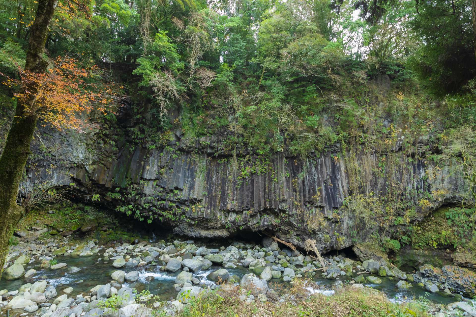 そして、一番の見どころともいえるのが柱状節理の岩壁。788年に霧島山の御鉢火山が噴火した際、流れてきた溶岩が冷え固まってできたものです。霧島が火山の地であることを改めて知るとともに、火山がもたらした神秘的な自然造形に圧倒されます。
