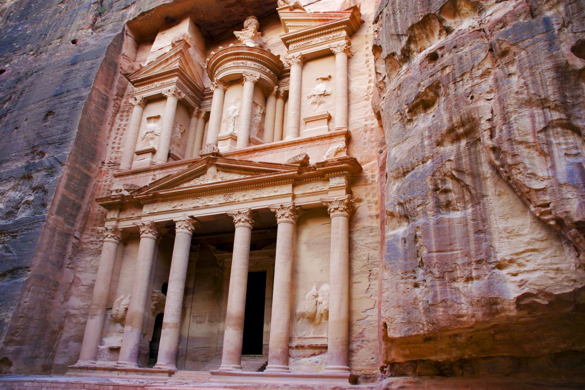 ヨルダン屈指の観光名所であるペトラ遺跡は、古代、キャラバンたちが行き交った場所に残る広大な史跡。ここで発掘された遺構のひとつ「エル・ハズネ」は、この地を支配していたナバタイ人の王の霊廟と考えられています。砂岩の崖を切り取って造られたファサード(正面)は、2000年の時空を超えて、バラ色に輝いています。映画『インディ・ジョーンズ最後の聖戦』のロケ地になったことでも知られ、多くのファンが訪れています。