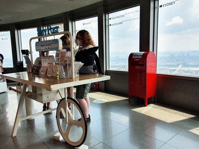 タワー5階の展望台には、Nソウルタワーのオリジナルグッズなどを販売している「タワーギフト」とグミ&キャンディ専門店「Weeny Beeny(ウィニービニー)」があります。タワーギフトにはタイムカプセル(1万2000ウォン、約1200円)が販売されていて、これはメッセージを書いてタイムカプセルの中にいれ、そのタイムカプセルを展望台で最大2年間保管してくれるというサービスです。また、絵はがきを購入しここで書いて送ることもできます。