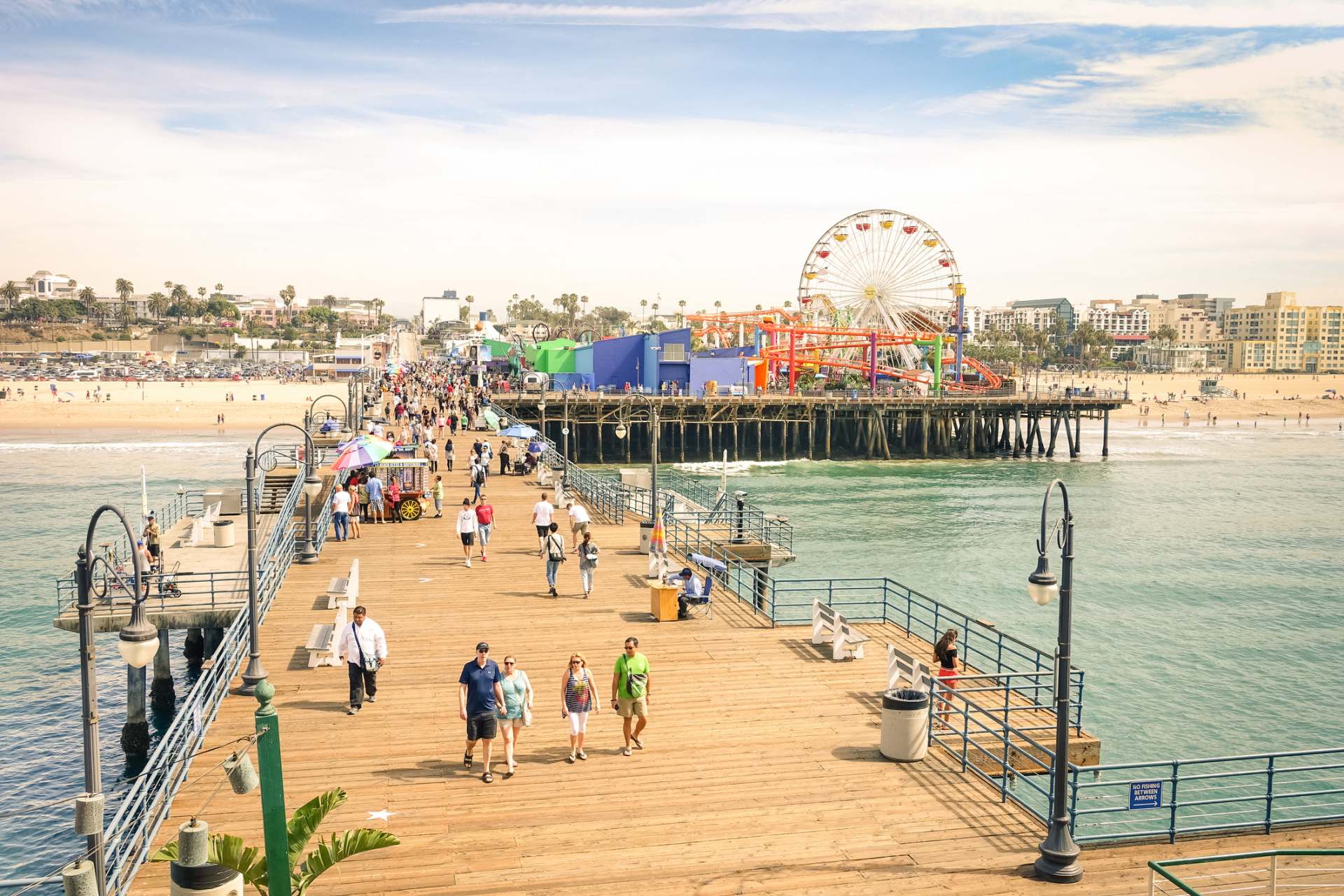 真っ青で広大な空と椰子の木が印象的なサンタモニカビーチは、ロスアンゼルス(ロサンゼルス)を代表する景色です。広い砂浜の中を突っ切るボードウォークをベニスビーチまでバイクで走ったり、スケートボードやビーチバレーを楽しむ地元民を眺めたりするだけで開放的な気分になれること請け合いです。サンタモニカピアで観覧車に乗ったり、サード・ストリート・プロムナードで食事や買い物を楽しんだりと、西海岸らしいライフスタイルを体験できます。