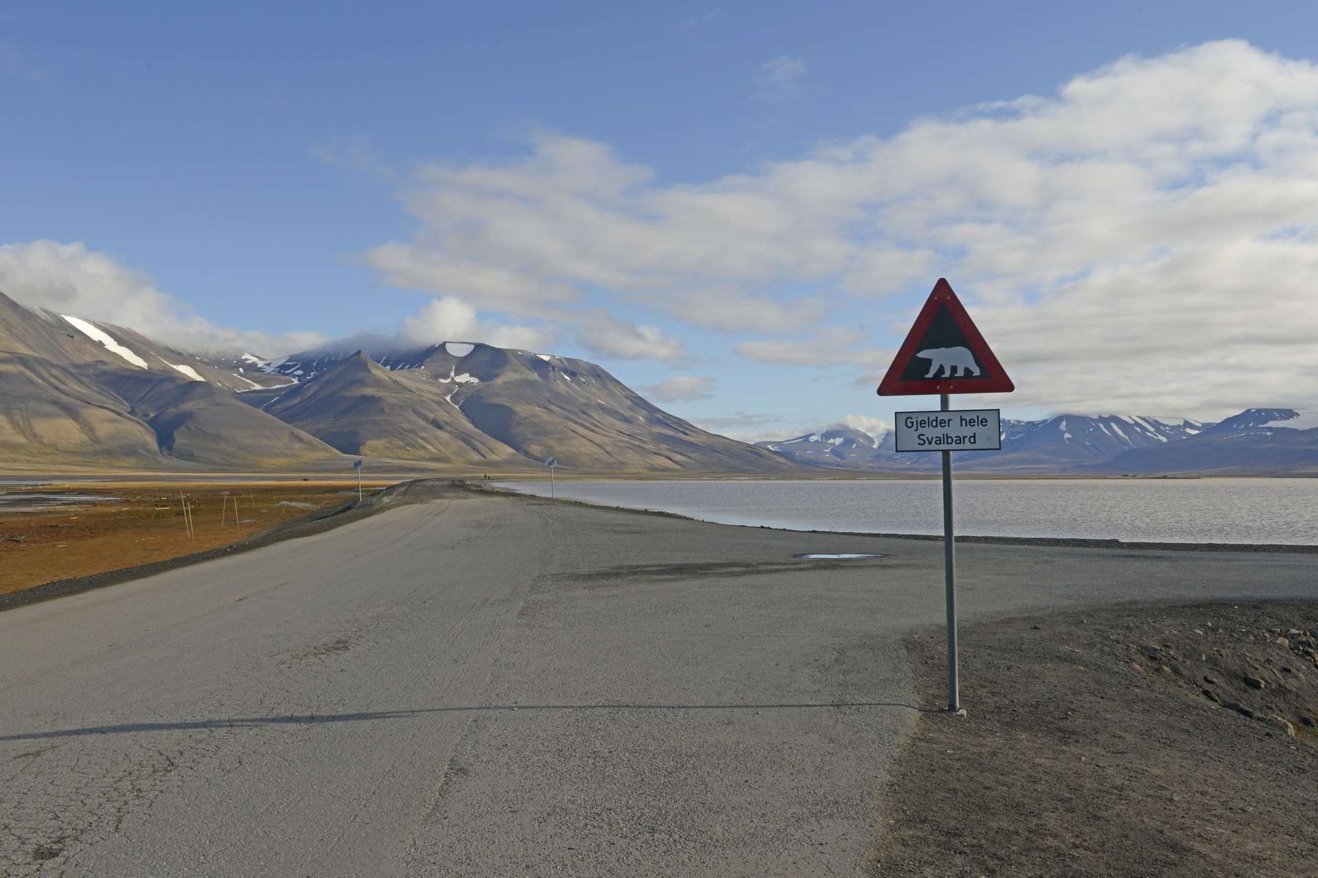 個人旅行が可能なスヴァールバル諸島の例をご紹介します。ゲートウェイの町であるロングヤービーエンの町なかではさすがに遭遇の心配はありませんが、30分ほど歩いたエリアに行くと、ホッキョクグマとの遭遇の危険性があります。町の東の道路にホッキョクグマ注意の道路標識が立っています。